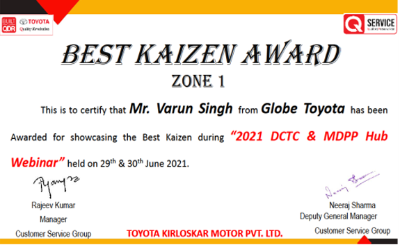 The 2021 DCTC & MDPP Hub Webinar was held on the 29th and 30th June, 2021, the duration of which focused on doing better for the planet by contributing towards hybrid vehicles and applying resource-saving measures across all Toyota locations. Hence, it was a proud moment that Globe Toyota Ambala and DCTC received the award for ‘Best Kaizen’, with a special mention to Mr. Varun Singh for keeping the organization’s profits and sustainability goals balanced perfectly.